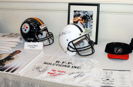 Gibson (r) auction off a photo autographed by Donovan McNabb of the Philadelphia